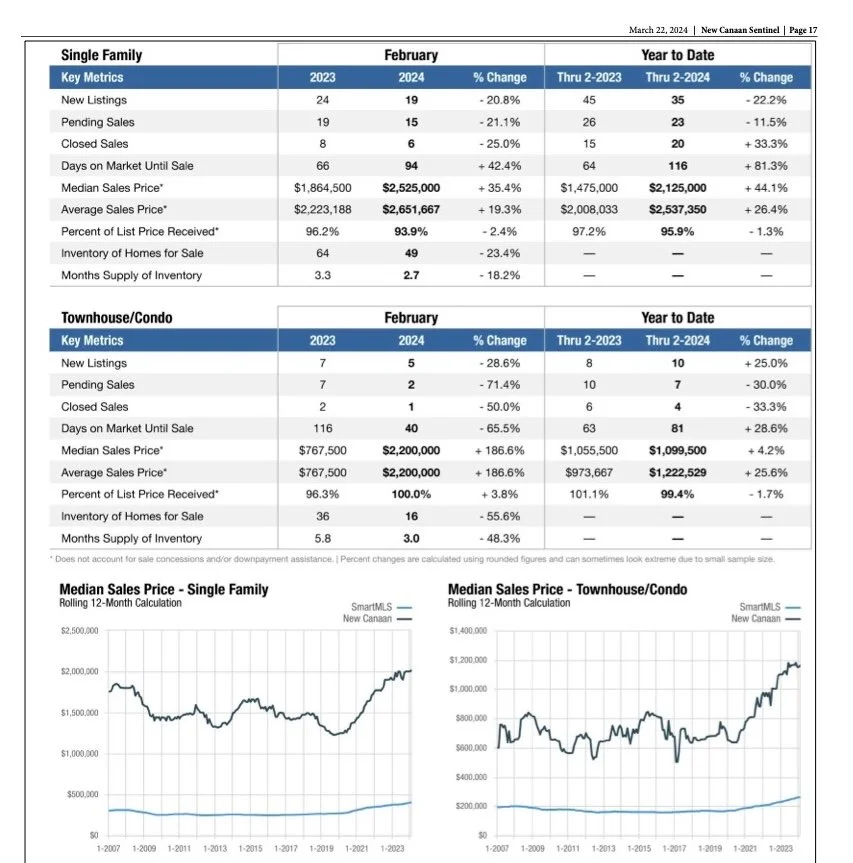 Notes from the Monday Meeting: Lots of buzz about NAR’s proposed settlement last Friday but nobody really knows anything. In the meeting we talked about Hubbard clause vs. bridge loan as a strategy when buyers are reluctant to list their home before bidding on another. Hubbard Clause is when the purchase is contingent on the sale of an existing home. There are only 49 homes for sale in New Canaan; 13 are new listings and 5 just accepted offers. Average and Median is way up in February and Year to Date. My podcast this week is on ADUs (accessory dwelling units) as an affordable housing solution. Search Boroughs & Burbs #130 on Youtube, Apple Podcasts or Spotify and join the conversation.