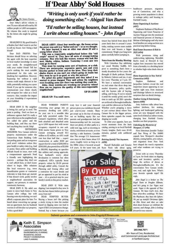 Week 100: If ‘Dear Abby” Sold Houses. John Engel’s Real Estate Column for the New Canaan Sentinel