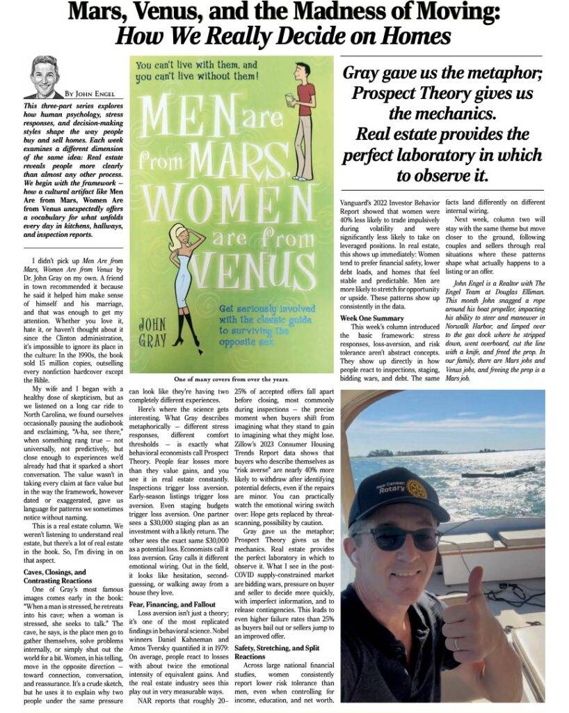 Week 106: Mars, Venus, and the Madness of Moving: How We Really Decide on Homes. John Engel’s Real Estate Column for the New Canaan Sentinel