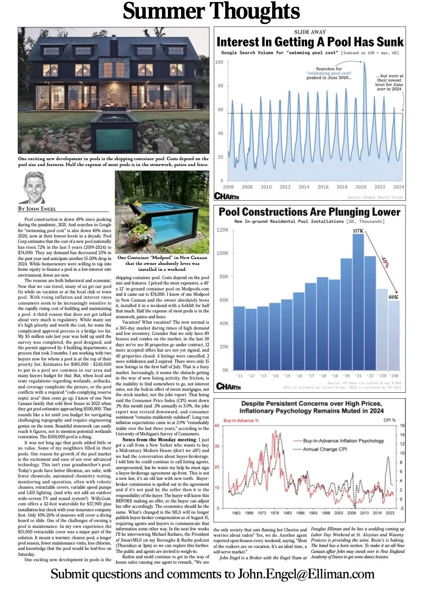 The reasons are both behavioral and economic: Now that we can travel, many of us get our pool fix while on vacation or at the local club or town pool. With rising inf lation and interest rates consumers seem to be increasingly sensitive to the rapidly rising cost of building and maintaining a pool. A third reason that does not get talked about very much is regulatory. While many say it’s high priority and worth the cost, for some the complicated approval process is a bridge too far. My $5 million sale last year was held up until the survey was completed, the pool designed, and the permit approved by 4 building departments, a process that took 3 months. I am working with two buyers now for whom a pool is at the top of their priority list. Estimates for $180,000 – $240,000 to put in a pool are common in our area and many buyers budget for that. But, when local and state regulations regarding wetlands, setbacks, and coverage complicate the picture, or the pool conflicts with a required “code-complying reserve septic area” then costs go up. I know of one New Canaan family that sold their house in 2022 when they got pool estimates approaching $500,000. That sounds like a lot until you budget for navigating challenging topography and require engineering genius on the team. Beautiful stonework can easily reach 6 figures, not to mention potential wetlands restoration. The $500,000 pool is a thing.