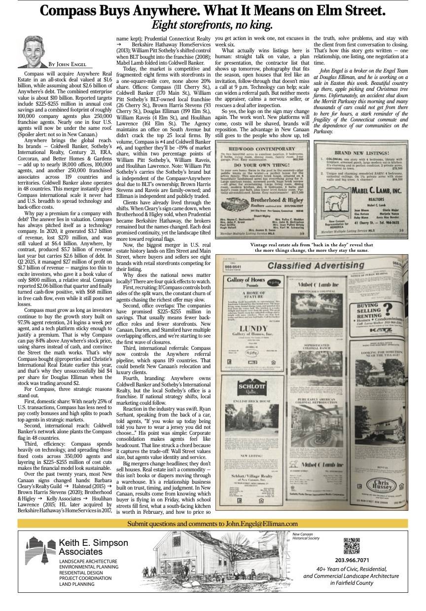 Compass will acquire Anywhere Real Estate in an all-stock deal valued at $1.6 billion, while assuming about $2.6 billion of Anywhere’s debt. The combined enterprise value is about $10 billion. Reported targets include $225-$255 million in annual cost savings and a combined footprint of roughly 100,000 company agents plus 250,000 franchise agents. Nearly one in four U.S. agents will now be under the same roof. (Spoiler alert, not so in New Canaan)
