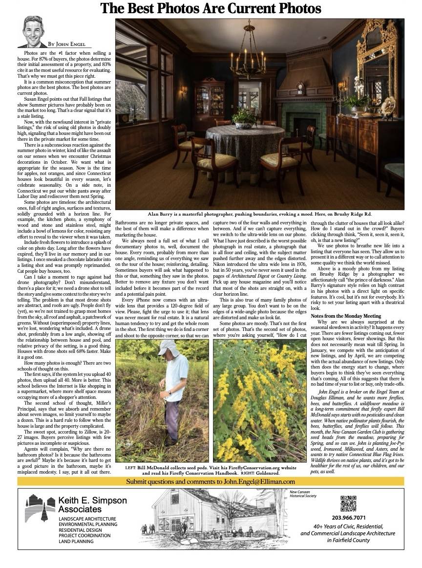 John Engel is a broker on the Engel Team at Douglas Elliman, and he wants more fireflies, bees and butterflies. A wildflower meadow is a long-term commitment that firefly expert Bill McDonald says starts with no pesticides and clean water. When the native pollinator plants flourish the bees, butterflies and fireflies will follow. This month the New Canaan Garden Club is gathering seed heads from the meadow, preparing for Spring (and so can we). John is planting Joe-Pye weed, Ironweed, Milkweed, Asters and wants to try native Connecticut Blue Flag Irises. Wildlife thrives on native plants, and it’s got to be healthier for the rest of us, and our pets and children as well.